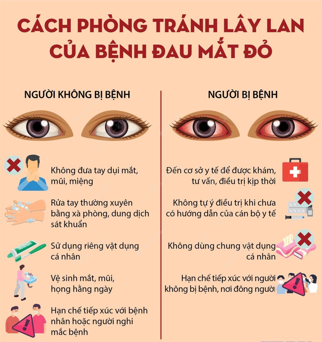 5. Người bệnh hoặc người nghi đau mắt đỏ cần hạn chế tiếp xúc với người khác và đến cơ sở y tế để được khám, tư vấn, điều trị kịp thời. không tự ý điều trị khi chưa có hướng dẫn của cán bộ y tế.