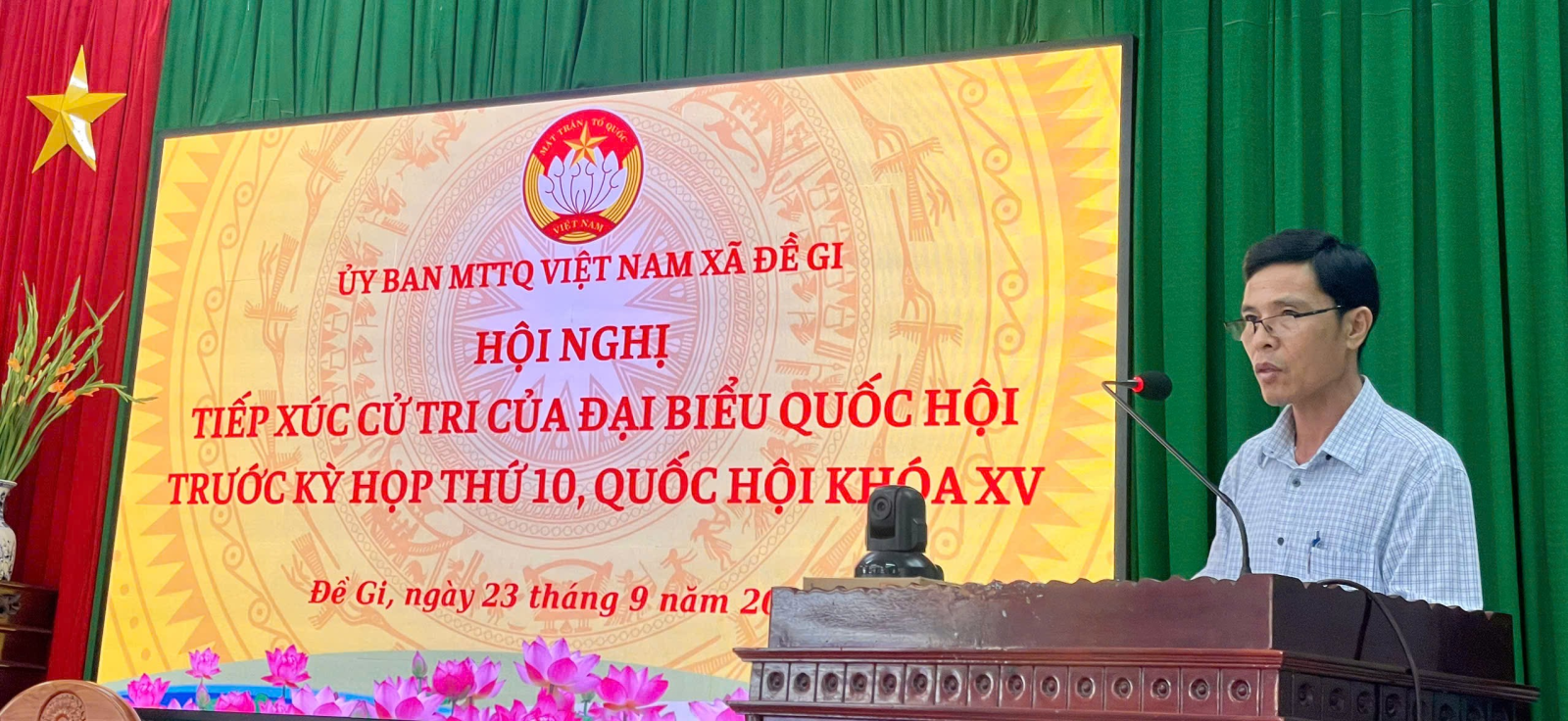 Trong không khí dân chủ, cởi mở, cử tri xã Đề Gi đã nêu nhiều ý kiến, kiến nghị tập trung vào các vấn đề: phát triển kinh tế nông nghiệp, ngư nghiệp; đầu tư cơ sở hạ tầng nông thôn; công tác an sinh xã hội; bảo vệ môi trường, cùng một số vấn đề liên quan trực tiếp đến đời sống, sinh kế của nhân dân.