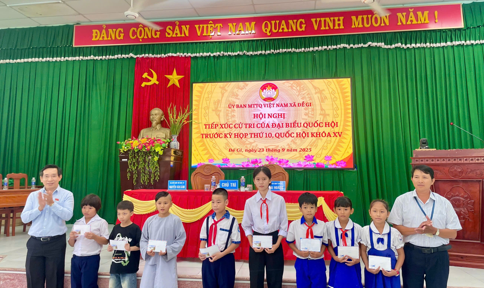 Nhân dịp này, Đại biểu Quốc hội Nguyễn Văn Cảnh đã trao tặng 20 suất quà cho các em học sinh có hoàn cảnh khó khăn trên địa bàn xã Đề Gi, góp phần động viên, khích lệ tinh thần học tập và chăm ngoan của các em.