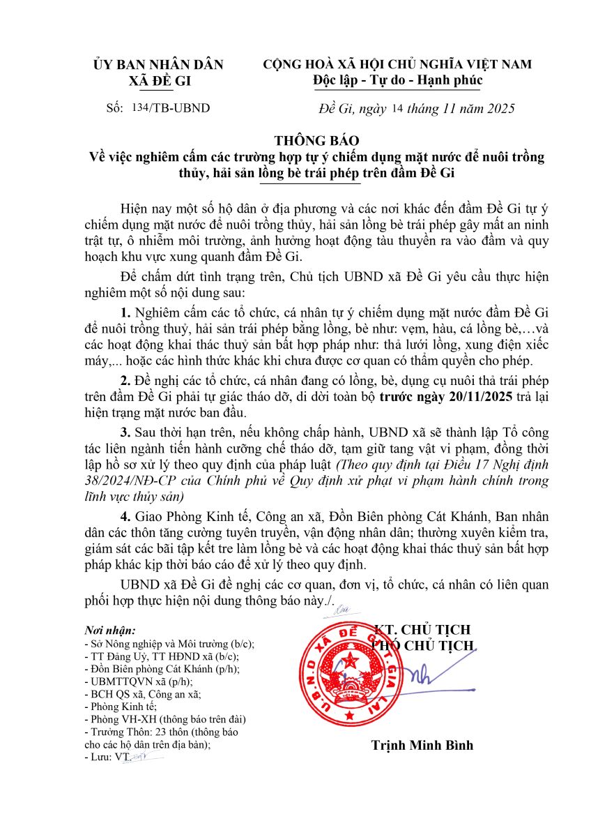 Thứ hai, 17/11/2025 | 09:34 A- A A+ | Thông báo về xử lý hoạt động chiếm dụng mặt nước trái phép trên đầm Đề Gi Chia sẻ Đọc bài Lưu UBND xã Đề Gi Tập tin đính kèm Trình duyệt không hỗ trợ iframe. Tác giả: UBND xã Đề Gi Tin liên quan Thông báo về xử lý hoạt động chiếm dụng mặt nước trái phép trên đầm Đề Gi Tỉnh đoàn Gia Lai và Tổng Công ty Phát điện 3 trao quà hỗ trợ người dân xã Đề Gi bị thiệt hại do bão số 13 Chủ động phòng tránh bệnh đau mắt đỏ Đồn Biên phòng Cát Khánh giúp dân khắc phục hậu quả bão số 13 Thủ tướng Phạm Minh Chính dự Ngày hội Đại đoàn kết toàn dân tộc tại xã Đề Gi: Biến thử thách sau bão thành sức mạnh đoàn kết Thủ tướng Chính phủ Phạm Minh Chính kiểm tra tình hình thiệt hại và công tác khắc phục hậu quả do bão số 13 tại xã Đề Gi Ngày hội Đại đoàn kết toàn dân tộc – Biểu tượng của thống nhất, gắn bó và phát triển quê hương Đề Gi THƯ KÊU GỌI "Ủng hộ Nhân dân khắc phục thiệt hại do cơn bão số 13 gây ra" ️🌪️ THÔNG BÁO KHẨN: CHỦ ĐỘNG ỨNG PHÓ VỚI BÃO KALMAEGI VÀ MƯA LŨ ĐẢNG ỦY XÃ ĐỀ GI TỔ CHỨC HỌC TẬP, QUÁN TRIỆT VÀ TRIỂN KHAI THỰC HIỆN NGHỊ QUYẾT ĐẠI HỘI ĐẢNG BỘ TỈNH GIA LAI LẦN THỨ I, NHIỆM KỲ 2025–2030